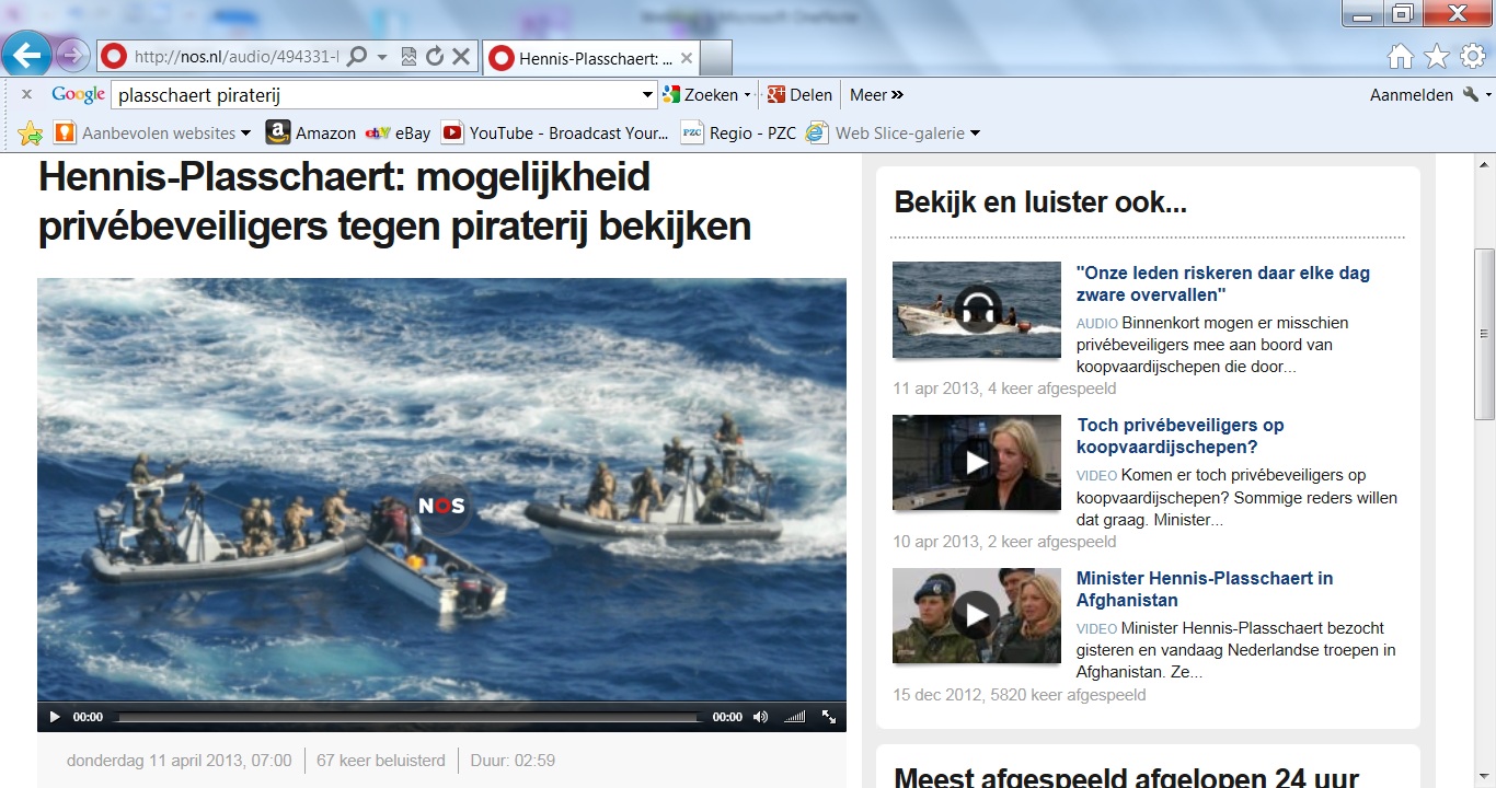 Waarom houdt de Nederlandse regering zo halsstarrig vast aan deze positie? Het treinverkeer is al lang uitbesteed aan private partijen. De telefonie mocht geen overheidsaangelegenheid meer zijn. De energiebedrijven zijn allemaal verkocht. Zelfs een kerncentrale – dan praat je toch over aanzienlijke risico’s die leven en dood betreffen – werd van het bordje van de overheid afgeschoven. Maar als het gaat om scheepsbeveiliging wil de overheid ineens alle touwtjes in handen houden. Bewaking aan de wal is al lang gemeengoed, waarom dan niet op het water? Ja, vanwege het geweldsmonopolie van de overheid, wordt er gezegd. Maar als diezelfde overheid met dat prachtige geweldsmonopolie niet in staat is haar burgers te beschermen, hoe zit het dan? Kan er niet zoiets als een “bijzondere opsporingsambtenaar te water” worden gecreëerd (zoals er bijvoorbeeld ook jachtopzieners zijn). Er kunnen toch goede protocollen worden ontwikkeld waaraan de beveiligers moeten voldoen?